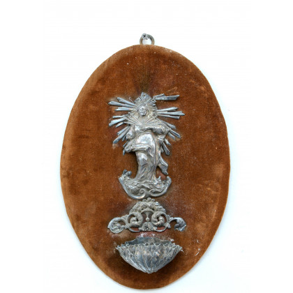 Antica acquasantiera in argento raffigurante Madonna con maschera e fregio a motivi vegetali montata su pannello in velluto (difetti)