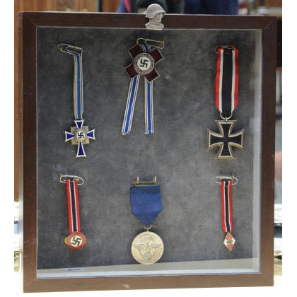 Teca contenente sei medaglie di epoca nazista in metallo e smalti. Cornice decorata da fregio raffigurante militare