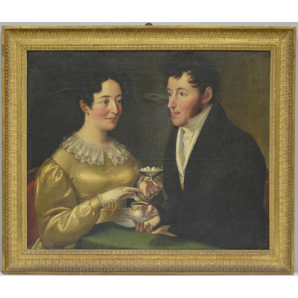 Maestro del XIX Secolo "Ritratto di Donna Elisabetta Corti Gola e del Dott. Cavaliere Domenico... Gola" olio su tela (cm 69.5x85) Firmato e datato in basso a sinistra. Al retro sul telaio: titolato. In cornice del sec. XIX in legno e pastiglia dorata (Difetti)
