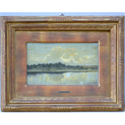 "Paesaggio lacustre"1891, olio su carta applicata a cartone (cm 18x30.5) Firma e data incise in basso a destra. In cornice (Difetti)