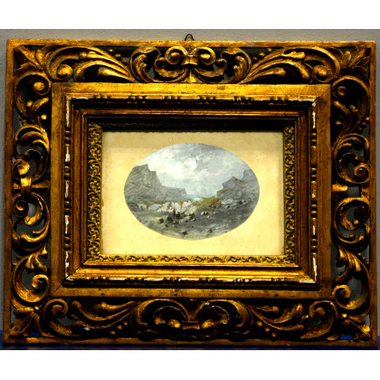 "Paesaggio roccioso" acquerello su carta ovale (cm 10,5x14). Firmato in basso a destra. In cornice (difetti).