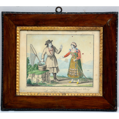 "Figure in abiti regionali" stampa acquarellata su carta (cm 19x24) iscritto, firmato e datato Napoli 1826 in basso, in cornice