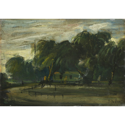 (?) "Paesaggio con figure a cavallo" olio su tavola (cm 30x40) firmato in basso a destra. In cornice