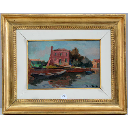 "Burano" 1975. Olio su cartone telato (cm 18x27). Reca firma postuma in basso a destra. Al retro: firmato, datato e locato. In cornice