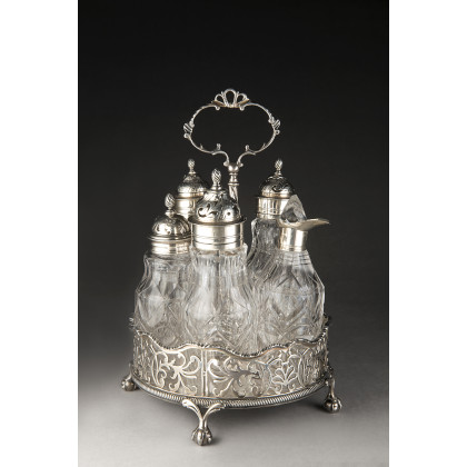 Porta ampolle in argento con base circolare decorata con ghiera traforata e cesellata a volute e terminante con piedi ferini. Ampolle in vetro con tappi in argento. Punzoni di Londra 1760, argentiere EA(difetti e mancanze)(gr.420) A silver cruet, London marks 1760 (defects and losses)