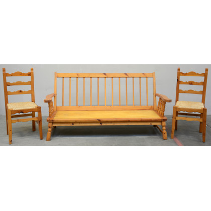 Lotto composto da un divano decorato a listelli e due sedie (difetti)