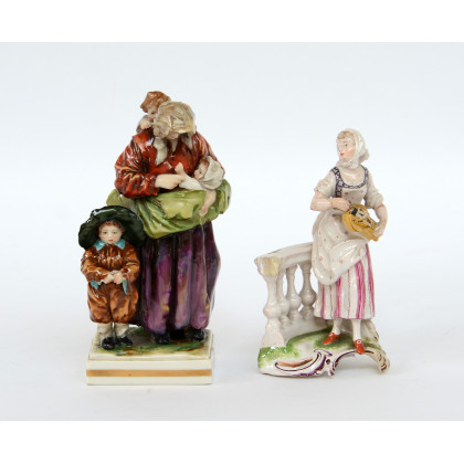 Lotto composto da due statuette in porcellana policroma raffigurante mamma con bambini e figura femminile (difetti)