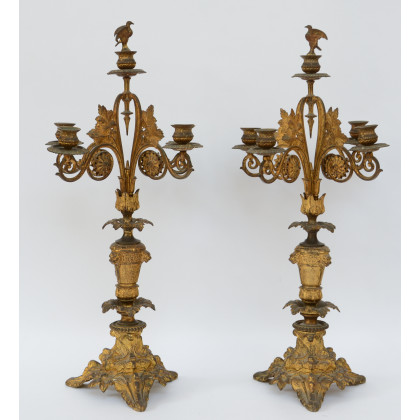 Coppia di candelieri a cinque fiamme in metallo dorato decorato a motivi vegetali, fiori e uccelli. Base sagomata. Inizio sec. XX (difetti)