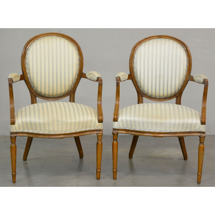 Coppia di poltroncine in noce con gambe anteriori tornite, schienale e seduta rivestita in tessuto a righe (difetti, mancanze e rotture)