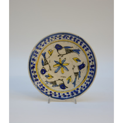 Manifattura mediorientale, piattino in ceramica (d cm 20) Decorato a fregi e pennuti (difetti)