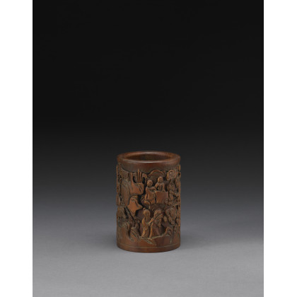 Portapennelli in legno intagliato con figure in un paesaggio boschivo Cina, fine XIX/inizio XX secolo A carved wood brushpot, decorated with figures in a wood landscape China, late 19th/early 20th century (h cm 13,5)