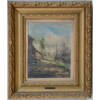 "Strada di paese" olio su cartone telato (cm 28x20), firmato in basso a sinistra. In cornice