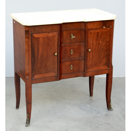 Mobiletto a tre cassetti in linea e due sportelli laterali, piano in marmo bianco (cm 78x83x37) (difetti)