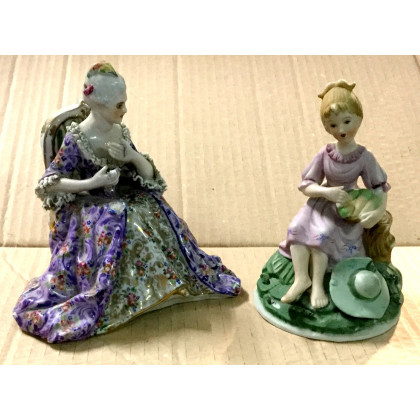 Lotto composto da una statua in porcellana policroma raffigurante gentildonna ed un bisquit raffigurante contadinella (lievi difetti)