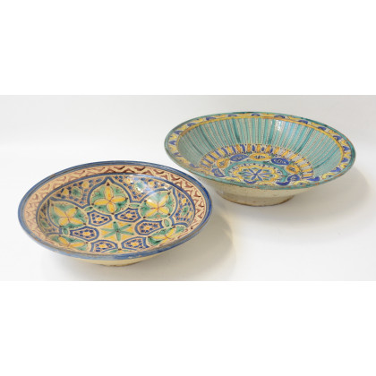 Manifattura mediorientale, lotto di due piatti in terraglia decorata a geometrie in smalti policromi (d cm 41 e 34) (difetti)