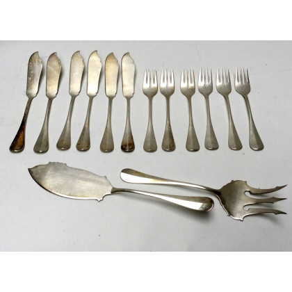 Servizio di posate da pesce in argento composto da sei coltelli e sei forchette e due posate da portata. Manici cifrati RC. Alessandria, marchi del Fascio (gr 850 ca)