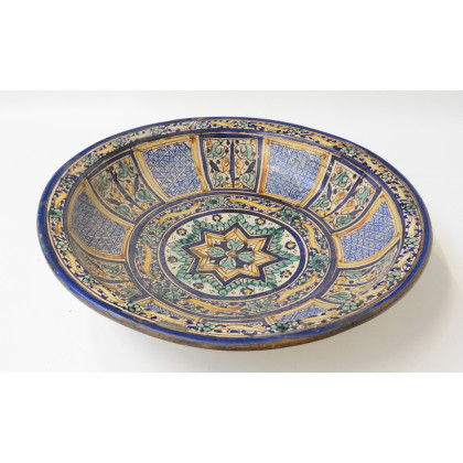 Manifattura mediorientale, piatto circolare in terraglia decorato a geometrie in smalti policromi (d cm 43)(difetti)