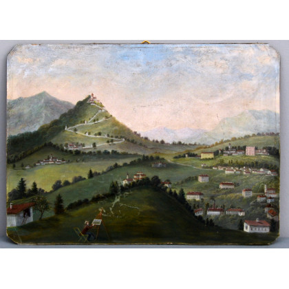 Scuola del sec. XIX "Villaggio montano" olio su cartone pressato (cm 22x33)