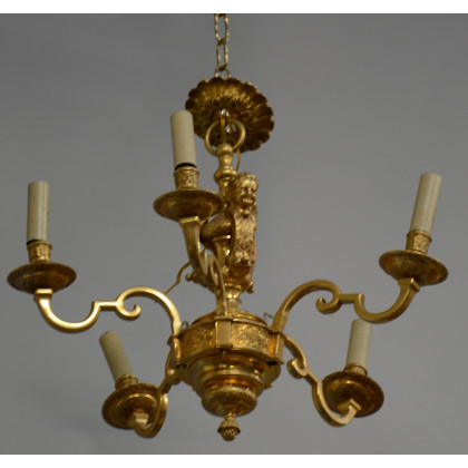 Lampadario in bronzo a cinque fiamme con montanti cesellati a teste di fauni con braccia sagomate (h cm 44)