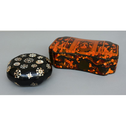 Manifattura orientale, lotto composto da due scatole decorate in papier mache e madreperla (difetti)