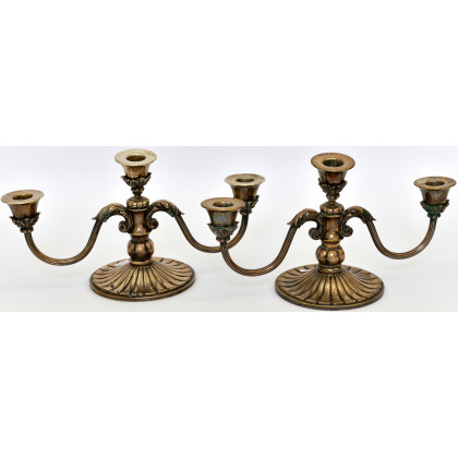 Coppia di candelieri a tre fiamme in argento con braccia cesellate a volute. Titolo 800 (h cm 17) (gr 1250) (difetti)