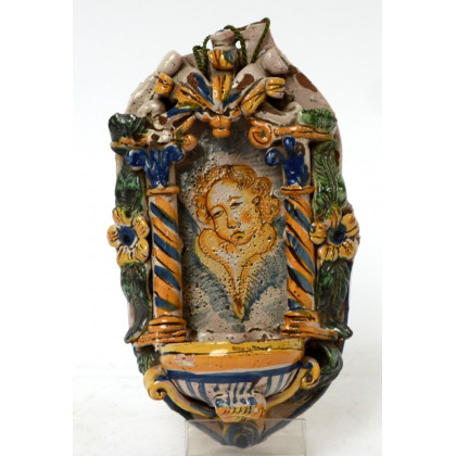 Fabbrica campana, sec. XVIII. Acquasantiera in maiolica policroma decorata in rilievo con colonne, motivi vegetali e fiori (cm 24x14) (difetti)