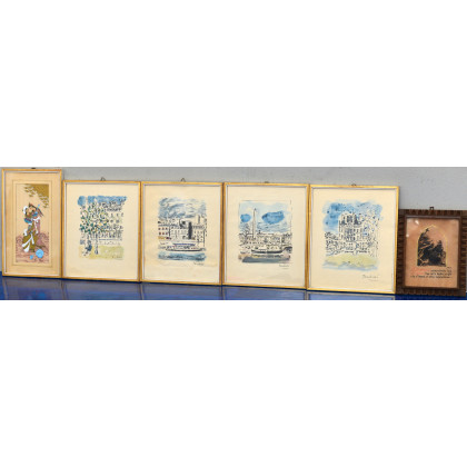 Lotto composto da quattro riproduzioni, un piccolo disegno ed un piccolo dipinto indiano. In cornici