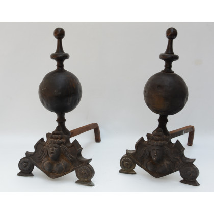 Coppia di alari in bronzo con puntali torniti e decorati da motivi stilizzati (h cm 45)
