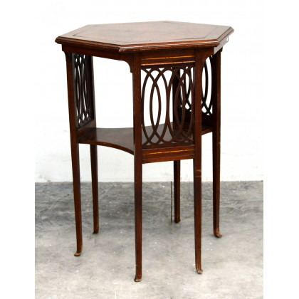 Tavolino esagonale in mogano a due ripiani e mantanti traforati. Piedi rastremati (cm 50x76x50)