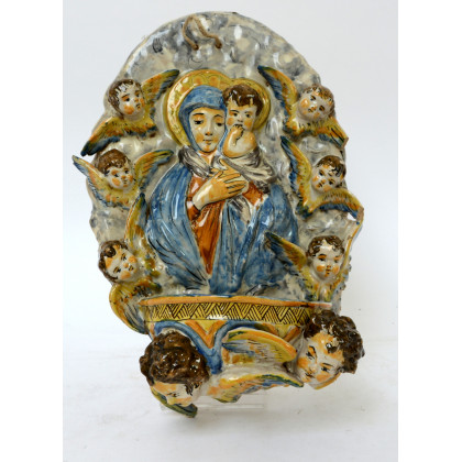 Manifattura napoletana, acquasantiera in maiolica policroma decorata al centro con madonna con bambino e ai lati e sulla base con teste di cherubini, monogramma CN 1742 sul retro (cm 39x26) (difetti)