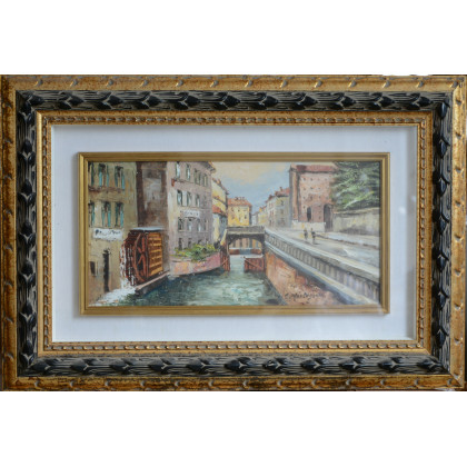"El tunbun de San Marc" olio su tela (cm 25x50) firmato in basso a destra. Autentica autografa e titolo al retro, allegato certificato di garanzia di Mimmo Massante su fotografia, in cornice