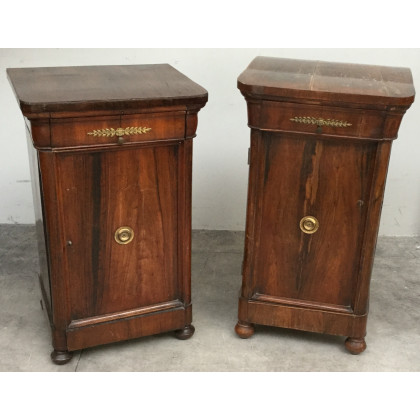 Due comodini lastronati ad un anta e un cassetto, piedi a cipolla, secolo XIX (difetti e restauri)