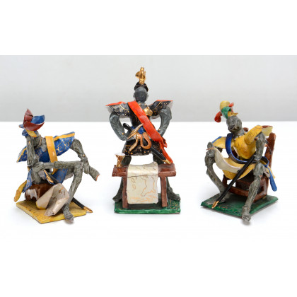 Lotto di tre statuine in ceramica raffiguranti personaggi con armature (difetti e mancanze)