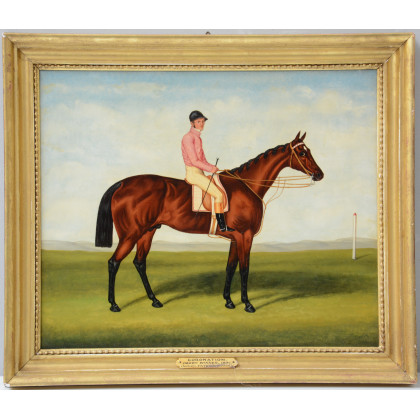 Scuola inglese. "Fantino a cavallo", olio su tavola (cm 32x35) in cornice dorata (lievi difetti)