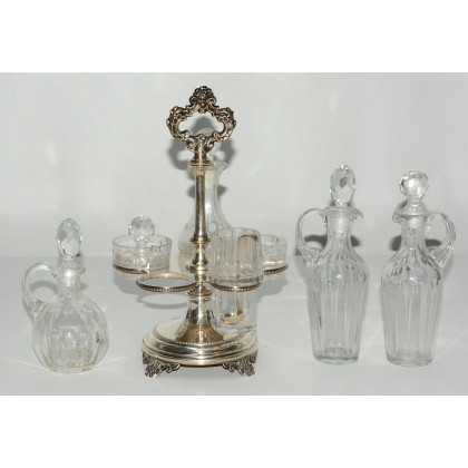 Cruet-stand in argento con contenitori in vetro a cui si aggiungono tre oliere non pertinenti. Titolo 800 (gr 420 ca) (difetti e mancanze)