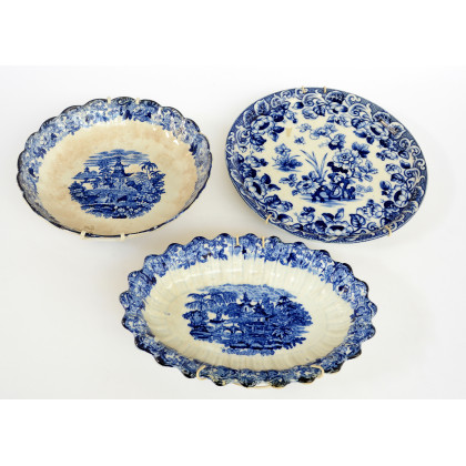 Manifatture diverse. Due piatti e una bacinella in ceramica decorati all'orientale in monocromia blu (difetti) Misure diverse