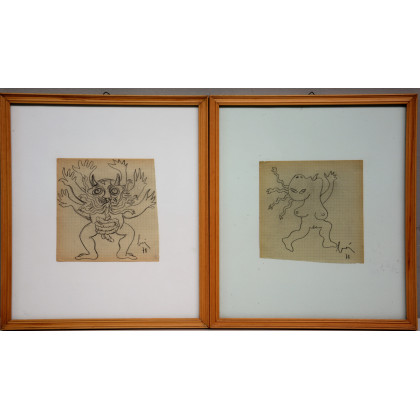 Lotto di due bozzetti a matita su carta quadrettata (cm 14x14 circa) in basso a destra, in cornici