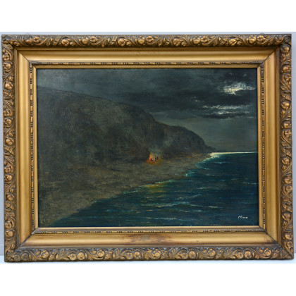 "Marina notturna con figure e fuoco" Olio su tela (cm 66x89) firmato in basso a destra, in cornice