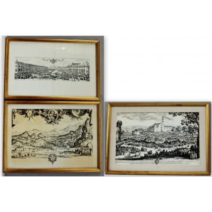 Lotto di tre riproduzioni da incisioni antiche, di soggetto e misure differenti, in cornici (lievi difetti)