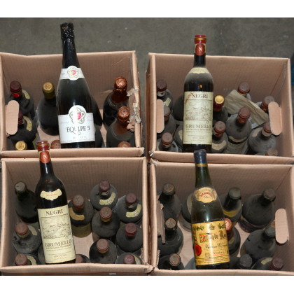 Lotto composto da quattro cartoni contenenti circa sessanta bottiglie di vini pregiati e non, di varie regioni (difetti)