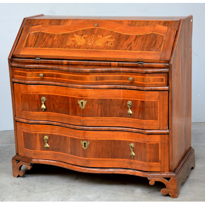 Antica ribalta filettata e intarsiata con tre cassetti e calatoia celante scompartimenti (cm 102x93,5x48) (lievi difetti e mancanze, restauri)