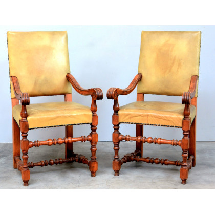 Coppia di poltrone in noce con braccioli sagomati e gambe tornite, rivestite in pelle e decorate con borchie (difetti)