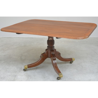 Tavolo con ripiano filettato squadrato, gamba a colonna tornita terminante in quattro piedi sagomati muniti di rotelle (135x73x103) (difetti)