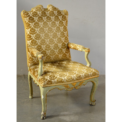 Poltrona in legno laccato e dorato con braccioli e schienale sagomato. Gambe mosse. Sec. XVIII