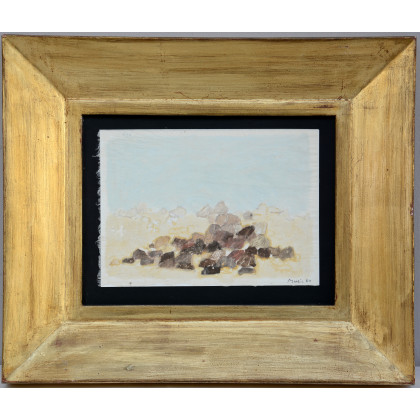 Ignoto "Paesaggio" tecnica mista su carta (cm 21,5x30). Reca iscrizione "Music 80" in basso a destra. In cornice