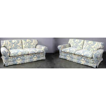 Coppia di divani imbottiti a due posti rivestiti in tessuto decorato a fiori