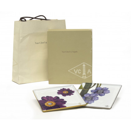 VAN CLEEF & ARPELS Confezione contenente due svuotatasche di forma quqadrata in porcellana decorati a fiori, con sacchetto originale