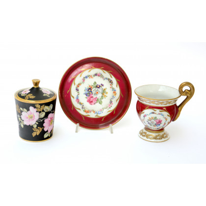 Manifattura di Limoges, lotto composto da una tazza da tè con piattino a decoro bordeaux e oro e una zuccheriera decorata con rose su fondo nero (lievi difetti)