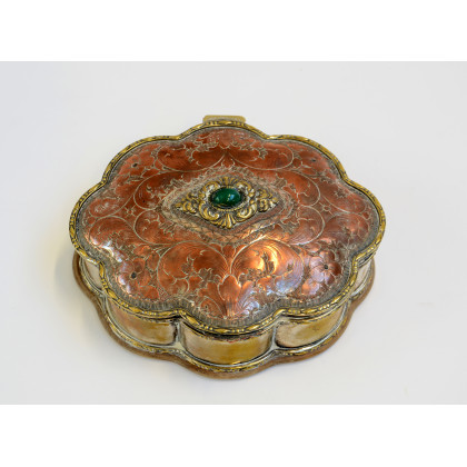 Cofanetto in metallo argentato su base in legno con corpo polilobato e coperchio centrato da pietra dura (cm 18x6x15) (difetti)