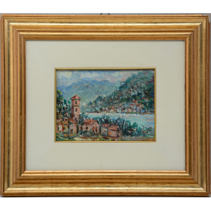 Ignoto "Il lago" olio su compensato (cm 14x19) Iscritto al retro, in cornice